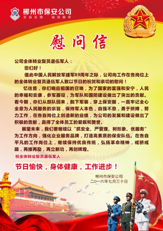 值此中國人民解放軍建軍89周年之際,公司向工作在各崗位上的全體轉業復員退伍軍人以節日和親切的慰問!